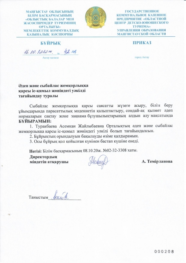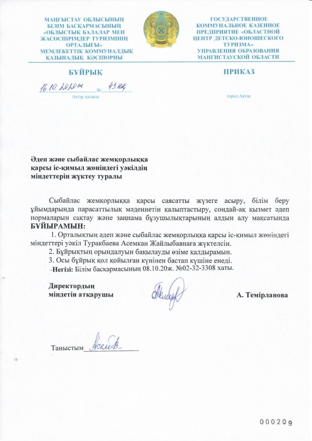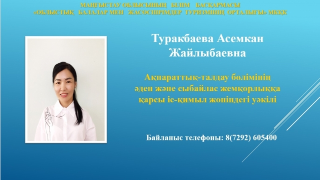 Сыбайлас жемқорлыққа қарсы саясатты жүзеге асыру, білім беру ұйымдарында парасаттылық мәдениетін қалыптастыру, сондай-ақ қызмет әдеп нормаларын сақтау және заңнама бұзушылықтарын алдын алу мақсатында Облыстық балалар мен жасөспірімдер туризмінің орталығында Әдеп және сыбайлас жемқорлыққа қарсы іс-қимыл жөніндегі уәкіл қызметіне ақпараттық-талдау бөлімінің жетекшісі Туракбаева Асемкан Жайлыбаевна тағайындалды.