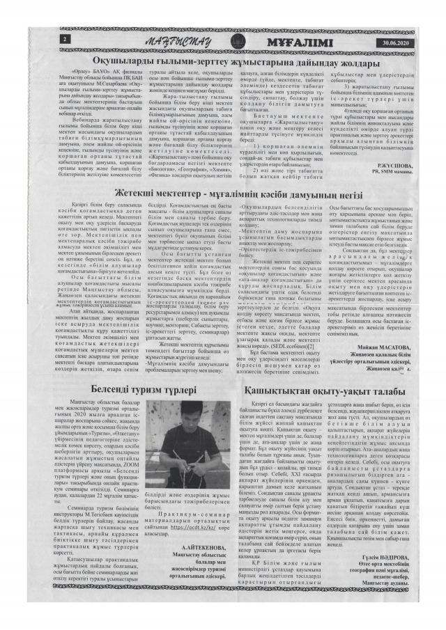 Статья методиста туристко-краеведческого отдела А.Айтекенова о семинаре «Виды активного туризма» в газете «Маңғыстау мұғалімі»